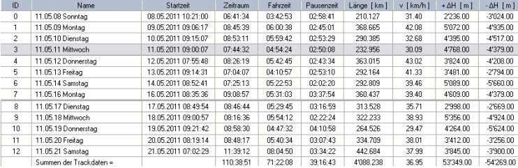 Routenstatistik der ganzen Tour